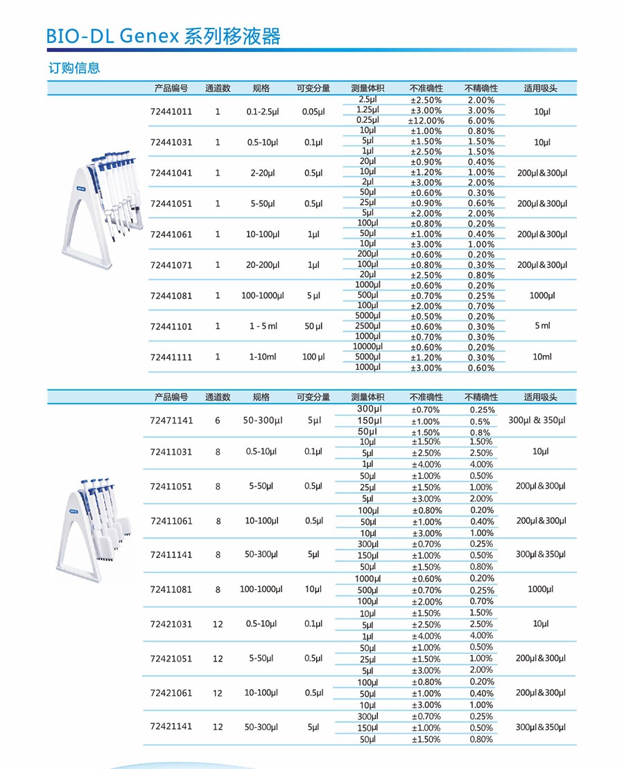 宝予德Genex系列移液器采用了优质的材料和优良的生产工艺使其于轻巧耐用于一体,并提供多年的可靠服务。Genex系列量程范围从0.1-10000ul。Genex系列移液器产品特点: